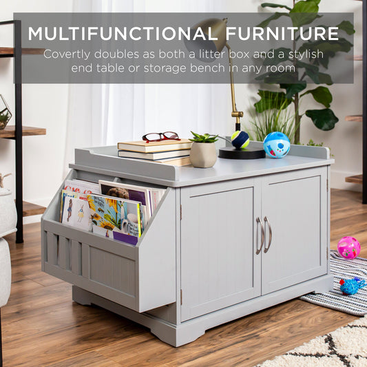 Large Wooden Cat Litter Box Enclosure & Storage Cabinet w/ Magazine Rack