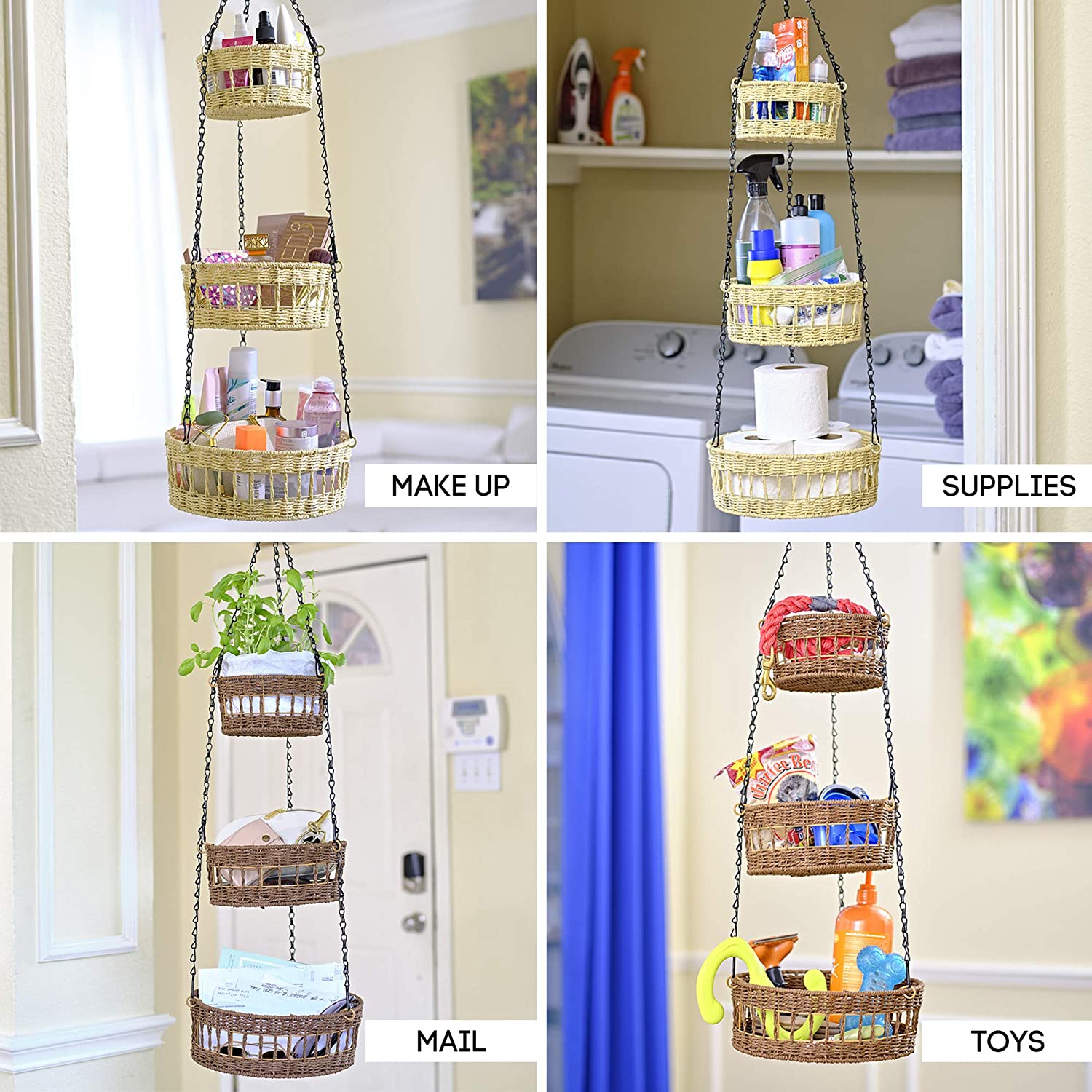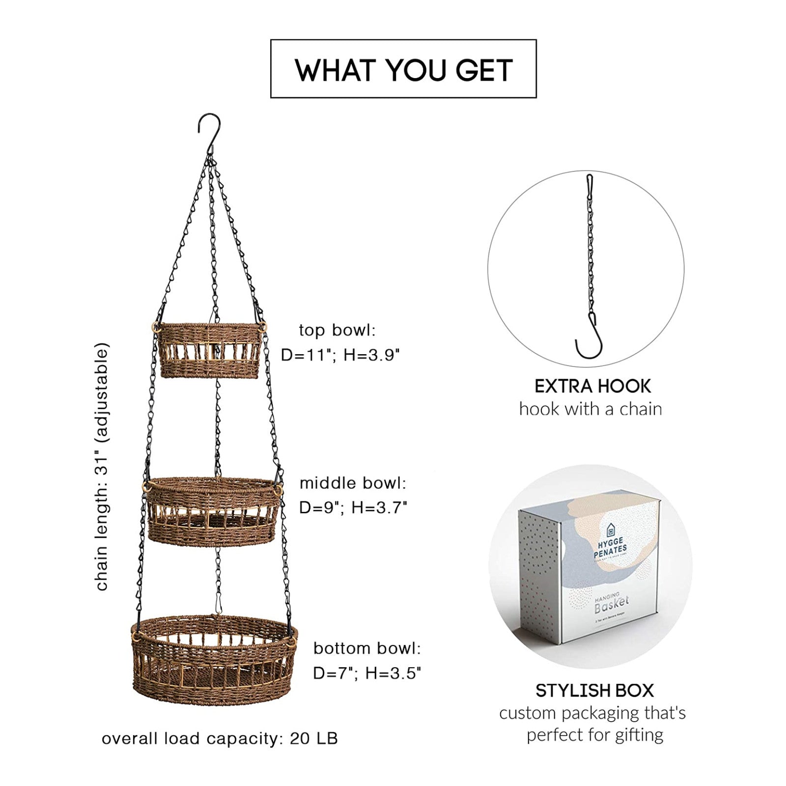 STYLISH SPACE SAVER: Hanging kitchen basket to organize and store produce keeping it fresh and ripe DETACHABLE BOWLS: Switch between hanging baskets and banana hanger, use small stand alone fruit bowl NATURAL MATERIALS: Paper rope woven plaiting - hanging wicker basket with heavy duty steel chain CONVENIENT HOLDER: Hanging basket keeps items at hand for every family member MULTIPURPOSE: Tiered hanging produce basket for kitchen, pantry, patio, RV, farmhouse, or anywhere