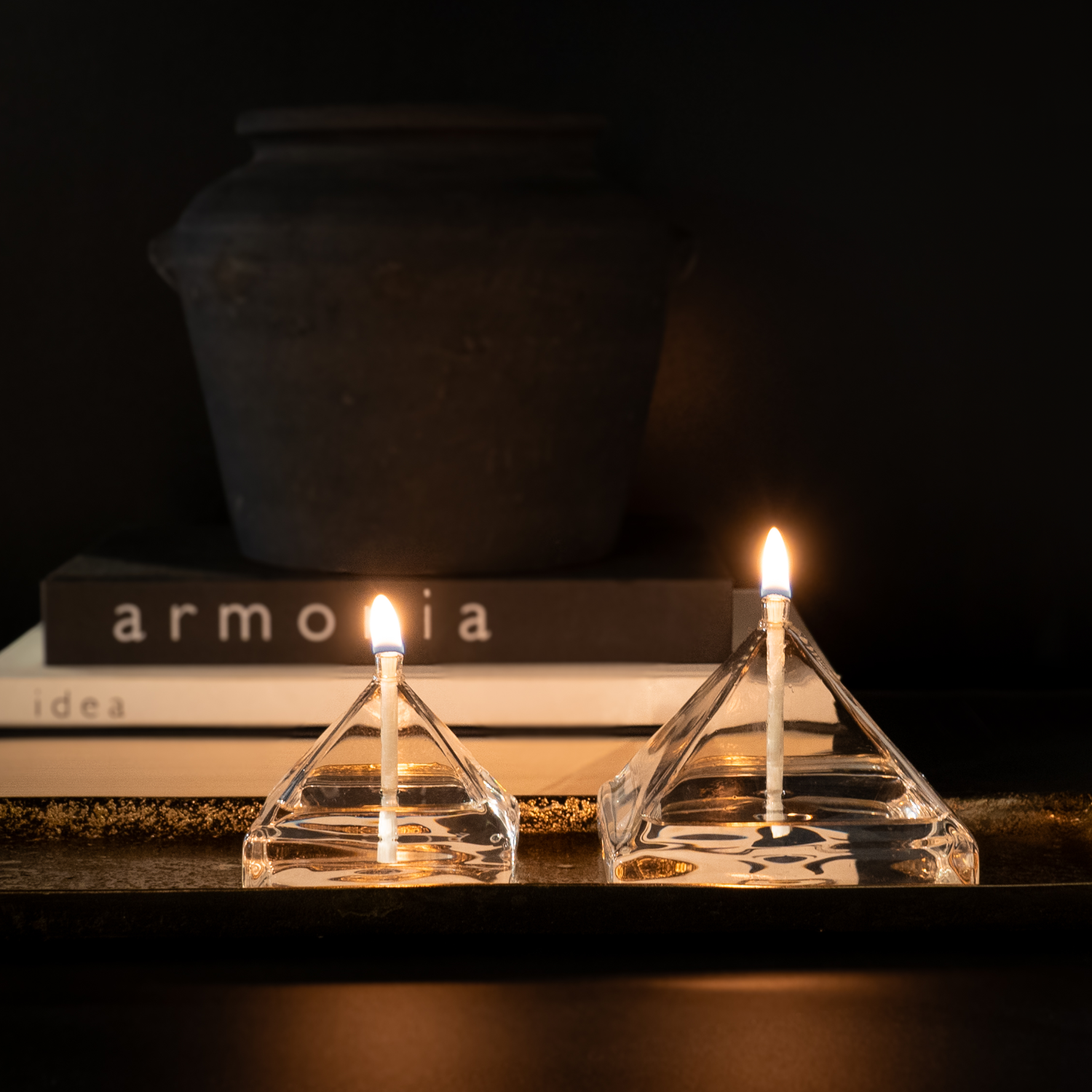 A revival of old-world architecture for the modern desk. The delicate clear glass pyramid-shaped vessel gives the candle a sculptural look that adds ambiance when lit. Trigon Oil Candles come with a lifetime fiberglass wick – which draws the oil upward through the candle without the wick itself burning, for a candle that can be re-lit over-and-over without having to replace the wick. Simply top-up the oil when low. The Trigon Oil Candle, available in a small or medium size adds a touch of whimsical ambience to any space.